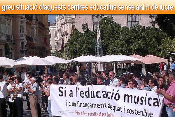 Les societats musicals i els ajuntaments, dels quals depenen els centres de música i conservatoris municipals, suporten un desfasament acumulat d’11 milions per un finançament que passa de 5,1 milions el 2009 a 1,4 el 2013 (-73%) amb tres retallades prèvies del 54%, 55% i 34%. A més, aquesta demora de dos anys està provocant que alguns centres no puguen afrontar les nòmines dels professors, impostos i pagaments.