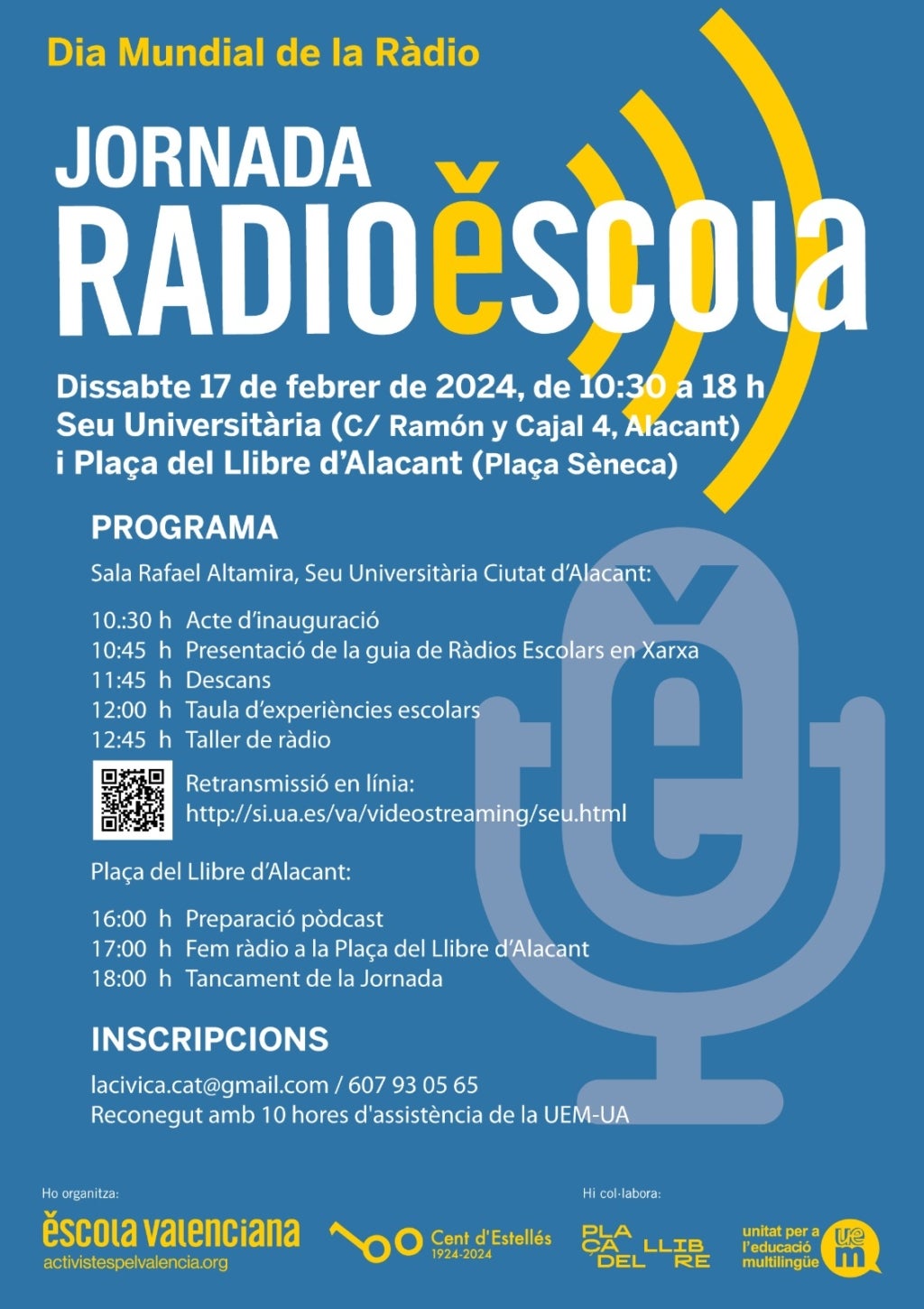 La pràctica radiofònica promoguda per Escola Valenciana estarà reconeguda, a més, amb un certificat de 10 hores lectives de la Unitat d’Educació Multilingüe de la Universitat d’Alacant. L’entitat en defensa del valencià se suma, d’aquesta manera, a les activitats que es desenvoluparan durant el cap de setmana d’entre el 16 i el 18 de febrer a l’esmentada Plaça del Llibre.