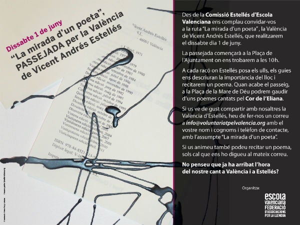 La passejada començarà a la Plaça de l’Ajuntament a les 10 del matí. A cada racó de la ciutat on Estellés posà els ulls, els guies descriuran la importància del lloc en la vida del poeta i es recitarà un poema.