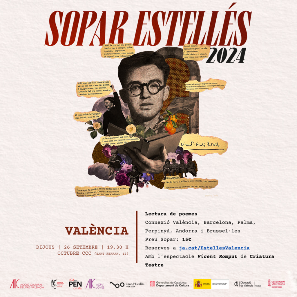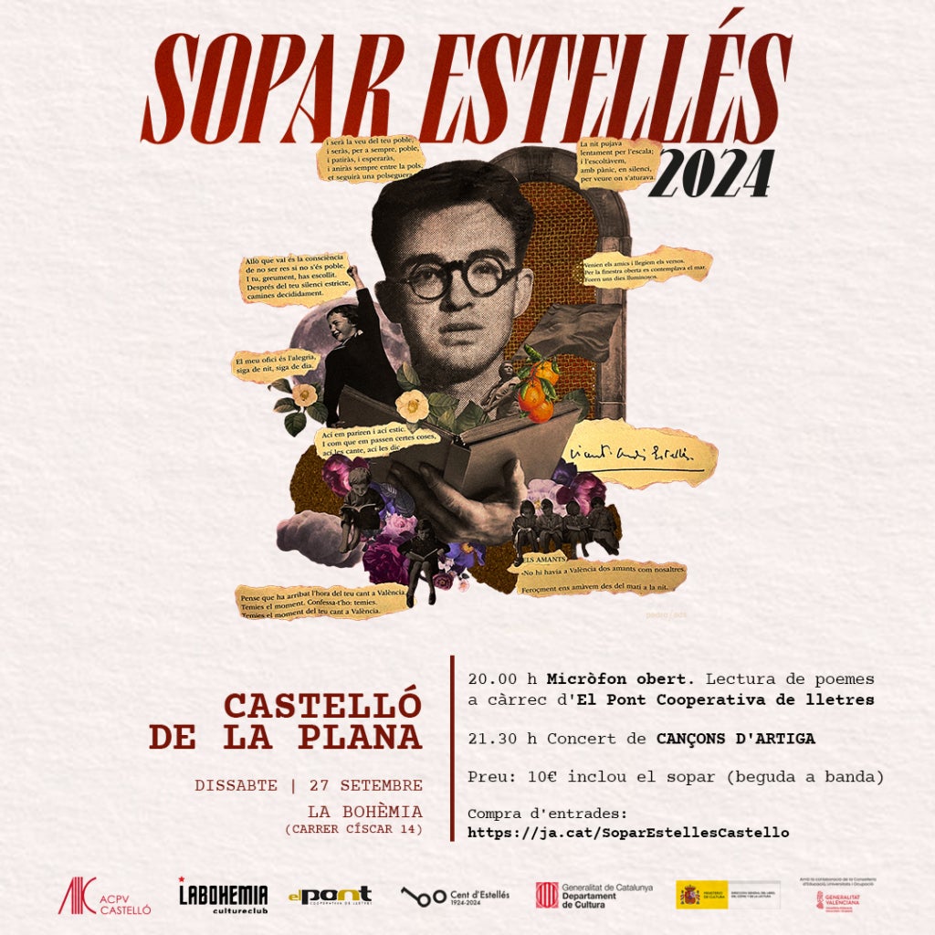 Un altre dels actes que se celebraran aquests dies serà el que acollirà Castelló de la Plana amb el tradicional Sopar Estellés a La Bohemia, que compta també amb l’impuls d’Acció Cultural amb una lectura de poemes a càrrec d’El Pont Cooperativa de Lletres a partir de les 21.30 hores i un concert de Cançons d’Artiga.