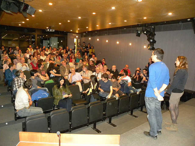 Al finalitzar la projecció de Què ens passa valencians?!, en una sala de projeccions de l’Octubre Centre de Cultura Contemporània que es va omplir de gom a gom, va tenir lloc un apassionat i intens col•loqui on els espectadors van tenir oportunitat de plantejar les seues preguntes -i opinions- al seu director, David Valls, i a la protagonista, Alina Moser, que juntament amb membres de les entitats col•laboradores -La Veu, El Tempir, ACPV, Escola Valenciana, El Micalet, Servei de Política lingüística de la UV i Tallers per la llengua- han fet possible el projecte.