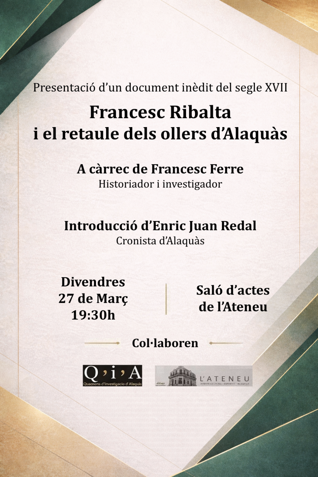 L’historiador Francesc Ferre ha trobat un document de principis del segle XVII que certifica de manera definitiva que el prestigiós pintor Francesc Ribalta (Solsona, 1565 – València, 1628) és l’autor del retaule de Sant Hipòlit d’Alaquàs (l’Horta Sud), anomenat popularment “dels ollers“. L’anunci oficial es va fer el 27 de març al saló d’actes de l’Ateneu Cultural i Esportiu del municipi, en un acte en què van intervindre el cronista oficial de la població, Enric Juan Redal, i el mateix Ferre.