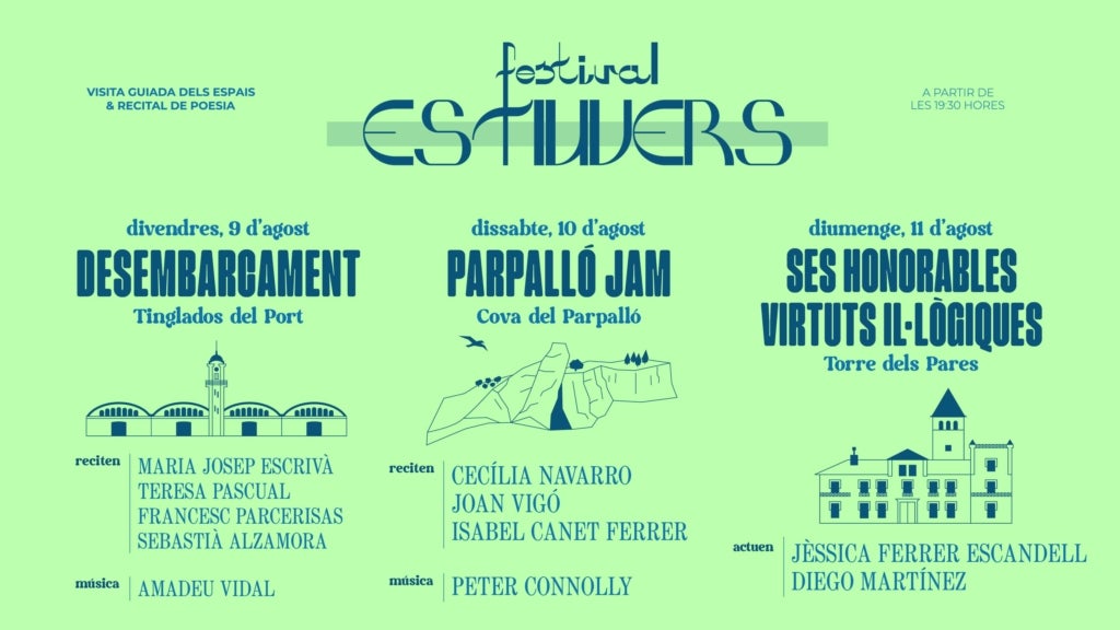 El festival de poesia de Gandia (Safor) Estiuvers prepara la seua 4a edició aquest 2024 amb la mateixa voluntat d’unir poesia, música, paisatge i patrimoni cultural. L’atractiu del festival s’ha caracteritzat per les ubicacions úniques dels recitals, i aquestes enguany seran els Tinglados del Grau de Gandia, la Cova del Parpalló i la Torre dels Pares. Els tres actes tindran lloc els dies 9, 10 i 11 d’agost respectivament, i començaran sempre a les 19.30 de la vesprada, hora en la qual es farà una visita guiada prèvia al públic d’uns 20 minuts aproximadament per tal de conèixer les curiositats de cada indret patrimonial. Després de la visita, com sempre, es donarà pas al recital poètic. Com a novetat, l’Estiuvers dedicarà aquesta edició a la memòria de Vicent Andrés Estellés, en honor al seu centenari.