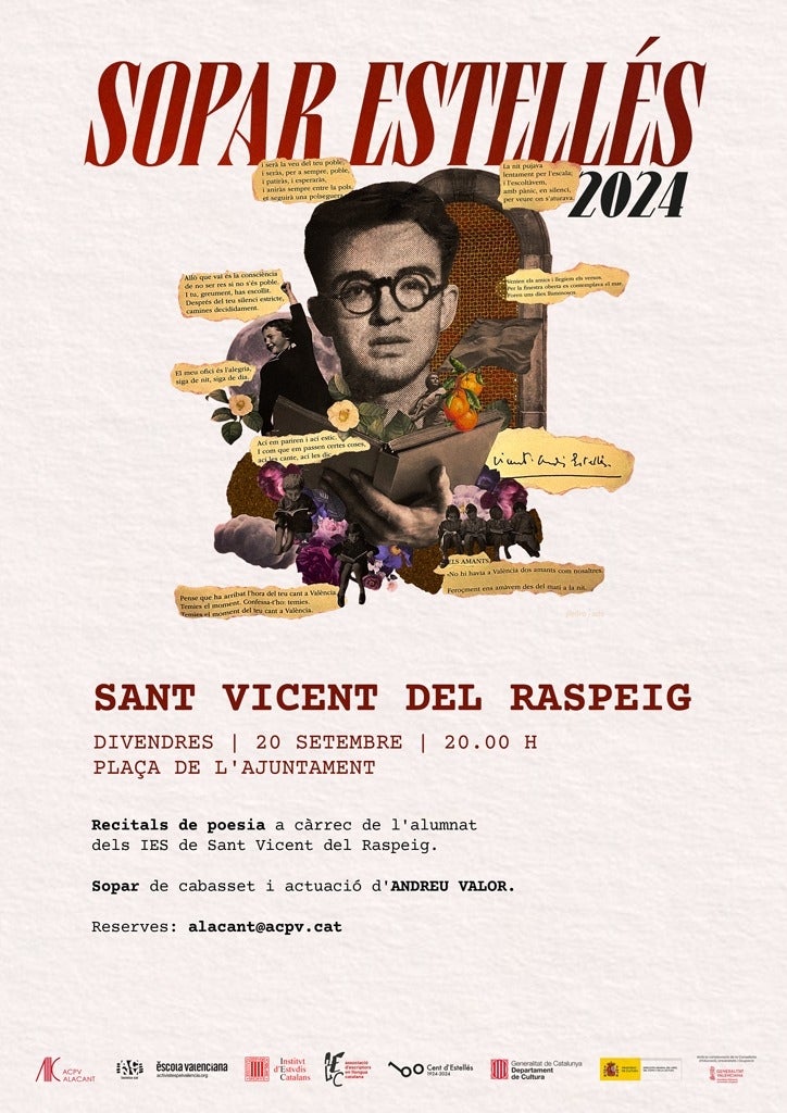 Gandia (Safor) i Sant Vicent del Raspeig (l’Alacantí) coincidiran aquest divendres dia 20 de setembre per a celebrar el centenari del naixement del poeta Vicent Andrés Estellés. Ambdues localitats organitzaran les respectives festes a partir de les 20.00 hores en formats diferents.