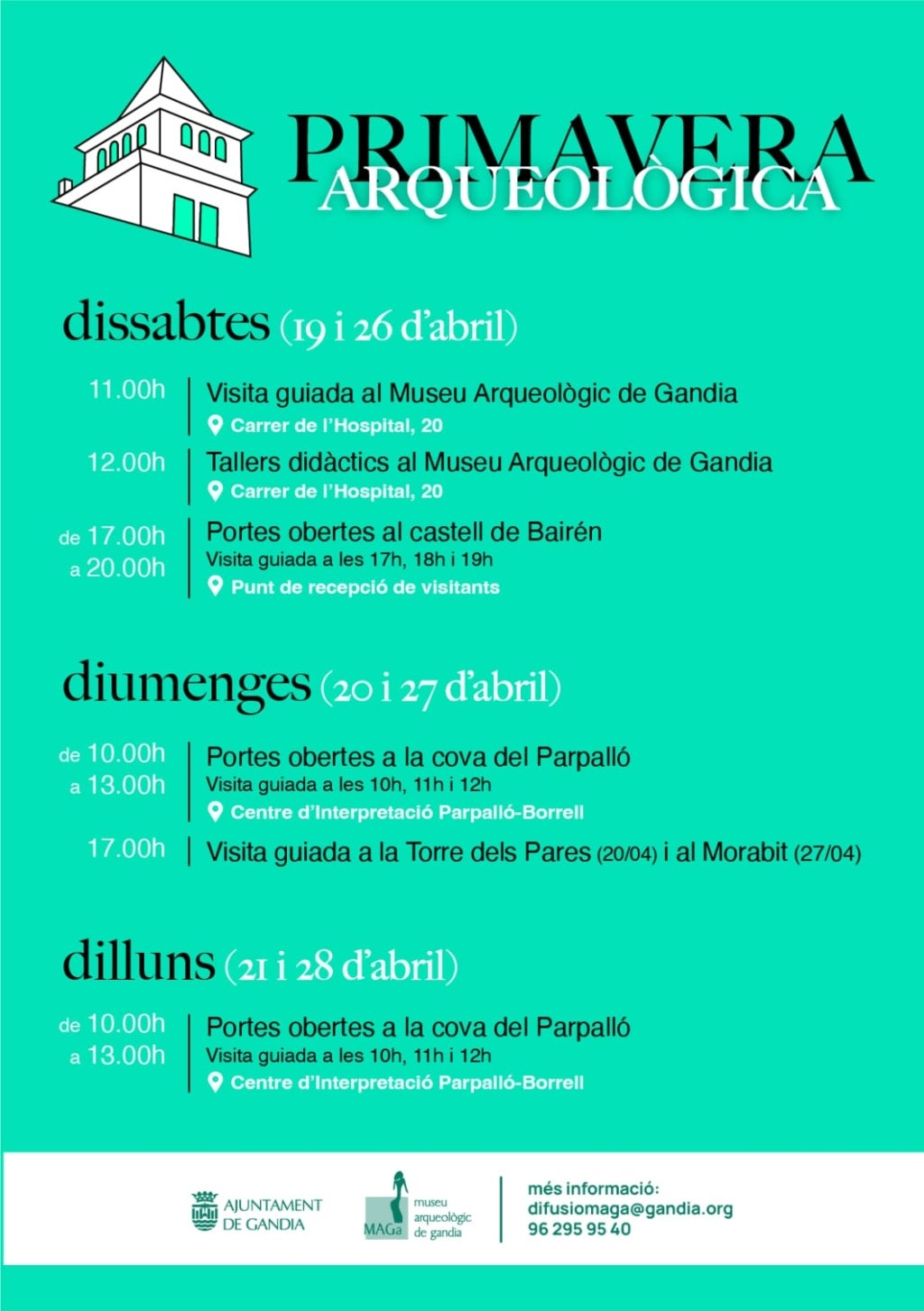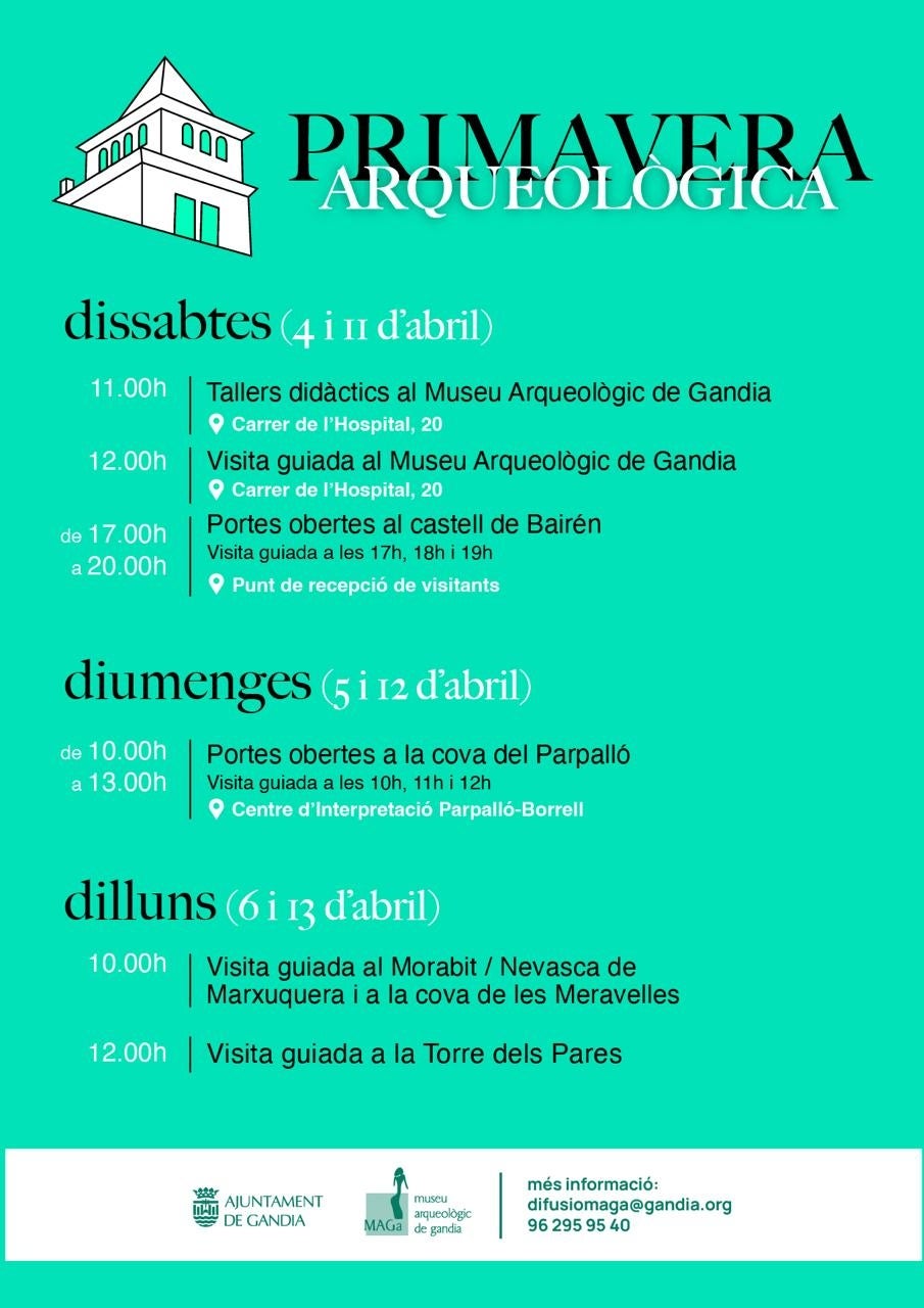 La programació es distribuirà al llarg de diversos dies, amb activitats que combinen divulgació i participació. Els dissabtes 4 i 11 d’abril hi haurà visites al MAGa i al castell de Bairén, que obrirà les portes amb recorreguts guiats. Els diumenges 5 i 12 d’abril, la cova del Parpalló serà protagonista amb visites al matí, i els dilluns 6 i 13 d’abril s’organitzaran rutes pel Morabit de Marxuquera, la cova de les Meravelles i la Torre dels Pares.