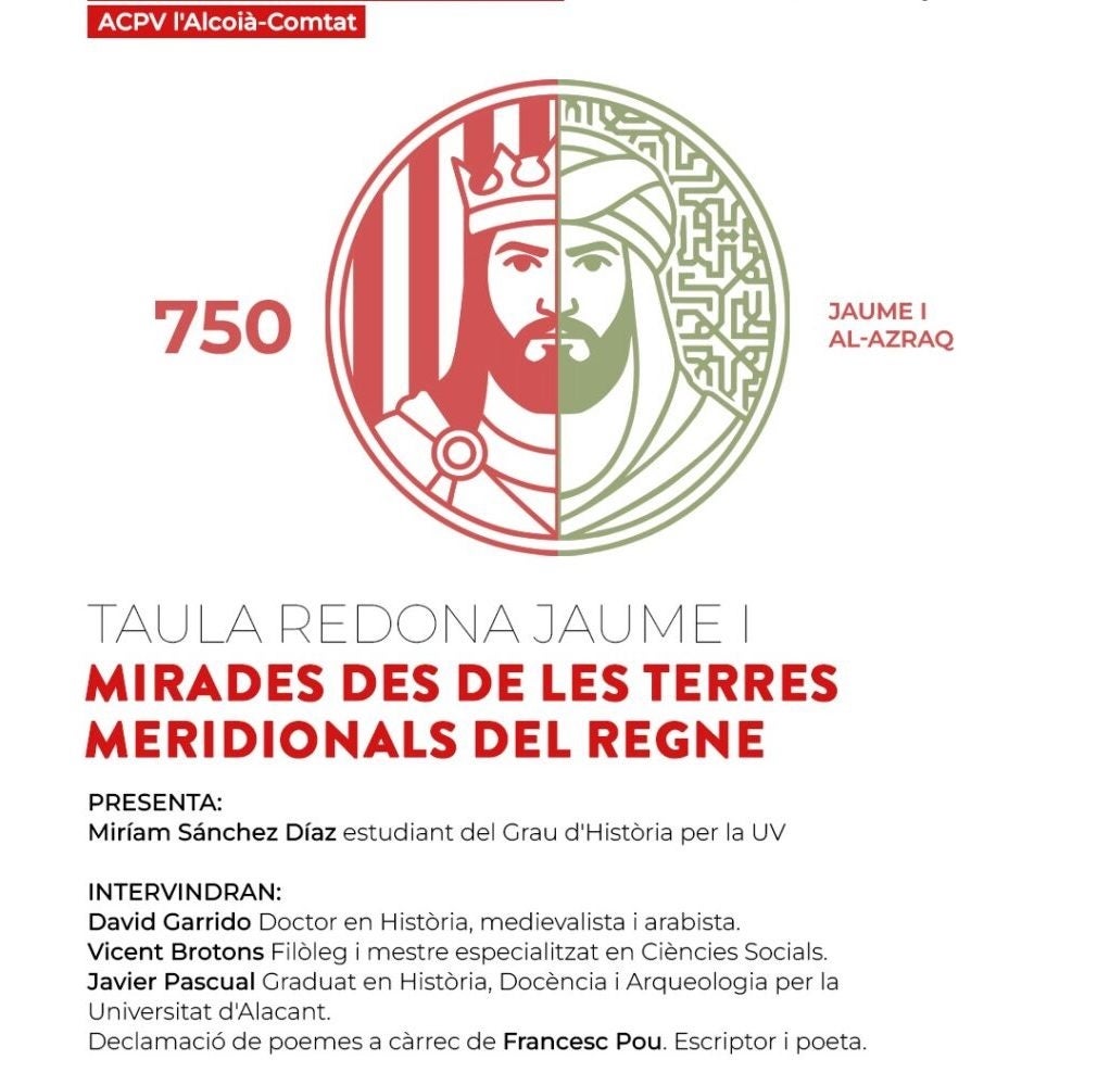 El Centre Ovidi Montllor d’Alcoi ofereix aquest dijous, 5 de març, la taula redona “Mirades des de les Terres Meridionals del Regne”, organitzada per Acció Cultural del País Valencià (ACPV). L’acte, que s’emmarca en les activitats commemoratives del 750 aniversari de la mort de Jaume I i l’Any Al-Azraq, té l’objectiu de mostrar una visió renovada i plural al context històric del segle XIII, posant el focus en el sud del Regne de València i en les seues dinàmiques culturals, socials i polítiques.
