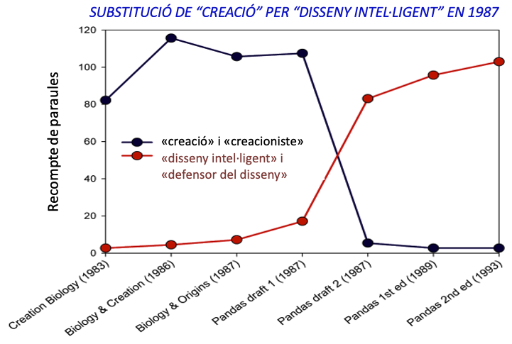 En 1981 neix la Fundació pel Pensament i l’Ètica (també creacionista i posteriorment fusionada amb Discovery Institute). El seu primer projecte fou publicar un manual creacioniste, complementari per les classes de biologia, que acabà titulant-se De pandes i persones. Titulats en zoologia i en biofísica, els dos autors es declaren creacionistes de la Terra jove, dels que defensen la literalitat del relat bíblic del Gènesi, atribuint al món una edat entre 6.000 i 10.000 anys(1). En l’eix horitzontal de la gràfica anterior trobem successivament: 3 textos precursors, 2 esborranys i les dues primeres edicions de Pandes. El gràfic visualitza la contundent substitució de termes, creació per disseny intel·ligent, entre els dos esborranys de 1987.