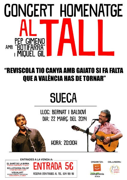 Aquest dissabte 22 de març el col·lectiu de Joves amb Compromís de Sueca retrà homenatge al grup valencià Al Tall al Centre Municipal Bernat i Baldoví.