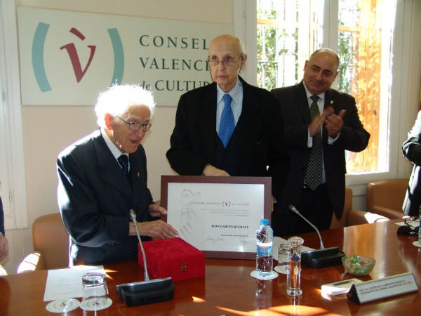 Joan Garcés Queralt (18 d’abril de 1914, Benifairó de les Valls, València), el director més longeu del món en actiu amb tres World Record Guinness, ha rebut hui el Diploma i la Medalla d’or del Consell Valencià de Cultura (CVC) per la seua trajectòria, de mans de Santiago Grisolía, president d’aquesta institució consultiva i assessora de la Generalitat Valenciana a la qual han acudit nombroses personalitats del món de la cultura i de la política.