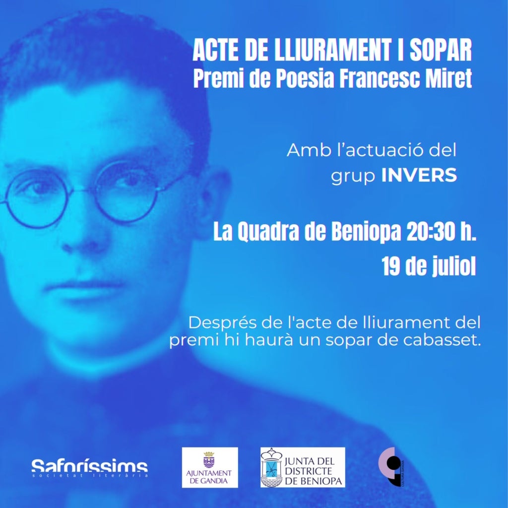 Aquest serà a les 20:30 hores d’aquest divendres, 19 de juliol, al centre cívic de la Quadra de Beniopa i comptarà amb les lectures dels quatre poemes finalistes, així com del guanyador, Ventre, de l’autor de Sollana (Ribera Baixa) Joan Lluís Senon Vila. La cerimònia estarà amenitzada per la música del grup Invers seguida d’un sopar de cabasset.