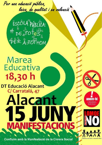 La PDEP d’Alacant fa una crida a tota la comunitat educativa, famílies, professorat, estudiants, consells escolars, claustres, AMPAS i entitats socials per organitzar, coordinar i promoure als centres i als seus entorns, accions específiques de denúncia i reivindicació que es proposen per a la setmana del 10 al 16, com són concentracions a les portes dels centres educatius, adhesió i lectura del manifest contra la LOMQE, recollida de signatures, festivals i fogueres reivindicatives i llaços i globus verds a les tanques dels centres.