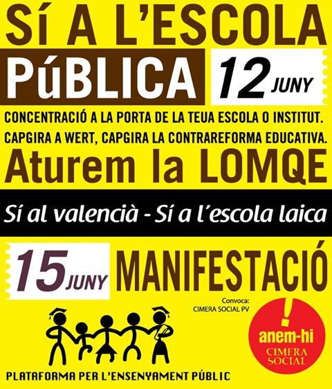 Amb el lema ‘Sí a l’escola pública, aturem la LOMQE. Sí al valencià, sí a l’escola laica’, les entitats membres convoquen les comunitats educatives a concentrar-se a les portes de les escoles i instituts per a realitzar qualsevol acció simbòlica en defensa de l’ensenyament públic i contra la llei Wert.