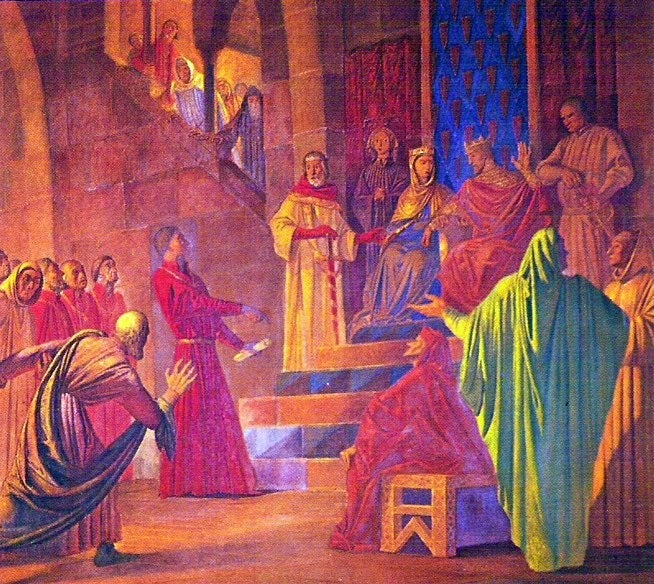 Arribaria també la indignada queixa d’Elionor en el sentit que “açò no ho consentiria el re don Alfonso de Castella, germà nostre, que ell els degollaria a tots”, a la que Alfons respondria: “Reina, reina, el nostre poble és franc, e no és així subjugat com és lo poble de Castella, car ells tenen a nós com a senyor, e nós a ells com a bons vassalls e companyons”.