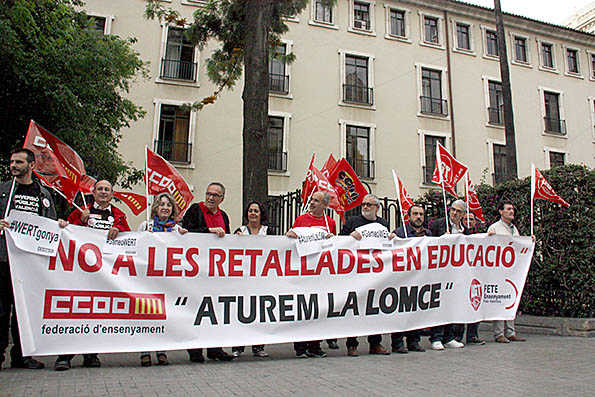 Sota la pancarta ‘No a les retallades en educació, aturem la LOMCE’ els concentrats han alertat que la nova llei d’educació trenca el consens amb la comunitat educativa i amb els partits de l’oposició i que suposarà un retrocés en drets lingüístics en un territori com el País Valencià, malmès per les retallades.
