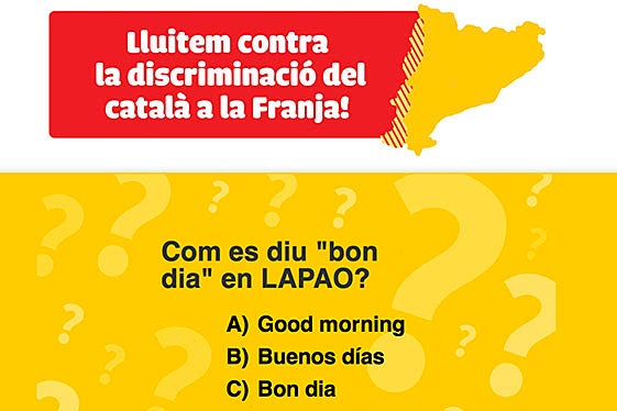 La Plataforma per la Llengua ha engegat una nova campanya que té com a objectiu denunciar la situació del català a la Franja i denunciar l’absurd que suposa el LAPAO en la realitat lingüística de la zona. La campanya simula un joc on-line a través del web estimoelcatala.cat que aparentment convidarà als usuaris a “aprendre” LAPAO i a traduir algunes paraules del català al LAPAO.
