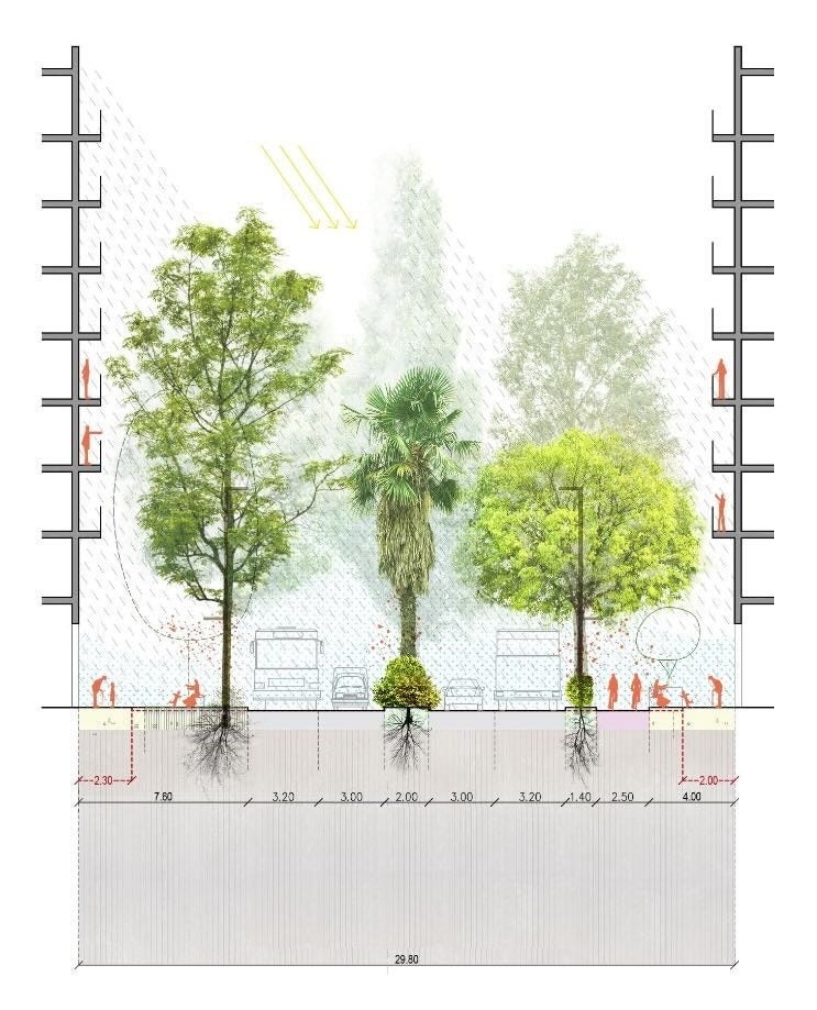 Tornem a la secció transversal i fixem-nos en la distribució dels usos. Hi veiem arbres en la mitgera de la via i a banda i banda. Els del centre ja hi són des de fa anys. És una filera de palmeres, que s’han plantat amb profusió des de l’època de la transició política espanyola. Fins a aquell moment, si no vaig errat, només tenia unes fileres de palmeres l’avinguda de José Antonio, avui del Regne de València. Palmeres n’hi havien, sempre n’hi han hagut, però no com a plantació en filera en tot un carrer, amb l’excepció mencionada. Però s’hi van plantar moltíssimes a partir d’aquell moment. Es veu que eren barates i representaven bé la «mediterraneïtat», per a uns, i les arrels morisques, per a altres. La palmera evoca un oasi, o el verger d’un jardí àrab. Però cal tenir molta set, davant les resseques palmeres urbanes, per patir aquest miratge.