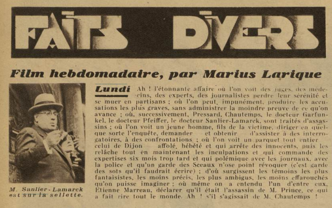 Fem ara un salt endavant i ens n’anem al 1934, i atenció que la cosa s’embolica un poc. Les restes del fiscal general de França, Albert Prince, apareixen lligades als raïls de la línia entre Paris i Dijon i la maleta on guardava els documents ha estat buidada. Prince investigava un cas d’estafa que implicava importants personalitats polítiques, empresarials i periodístiques conegut com el “cas Stavisky” -de fet, l’escàndol va fer caure al govern aquell any i va ser l’origen d’uns greus disturbis antiparlamentaris atiats per l’extrema dreta. La policia va acusar la màfia marsellesa de l’assassinat de Prince, encara que potser va ser un intent de desviar l’atenció, ja que tots els acusats acaben absolts. Enmig d’aquest embolic apareix, no ha quedat registrat ben bé com, el nom d’Henry Sanlier-Lamark i la seua amant. Com un metge militar que vivia en aquella època a Madrid (o almenys ho feia la seua dona) acaba sent interrogat per l’assassinat d’un fiscal a Dijon? Caldria una investigació que supera aquest article, però en tot cas, el que està documentat és que Sanlier-Lamark va ser interrogat i la seua versió contrastada amb la del vigilant de l’hotel de Dijon, tot al més pur estil de Mazón i El Ventorro. Encara que pareix que la cosa no aniria a més, a banda d’afectar l’estabilitat del matrimoni -potser la qüestió de l’amant hi va tenir algun pes- que pareix que es refredaria si bé no arribaria a trencar-se del tot.