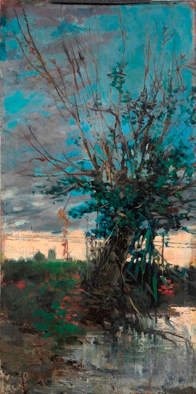 Es tracta d’una pintura a l’oli sobre taula de petit format (34,6 per 16,8 centímetres), que mostra un paisatge fluvial o lacustre. Executada segurament del natural amb una tècnica molt depurada, hauria estat realitzada als inicis de la seua carrera artística, concretament al 1881.