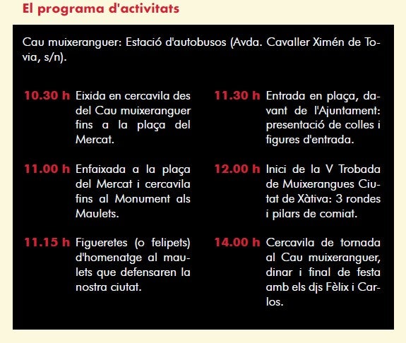 Aquest esdeveniment cultural és el més important de l’any per a la colla La Socarrà de Xàtiva, i comptarà amb la companyia de les muixerangues Valls del Vinalopó i Vall d’Albaida.