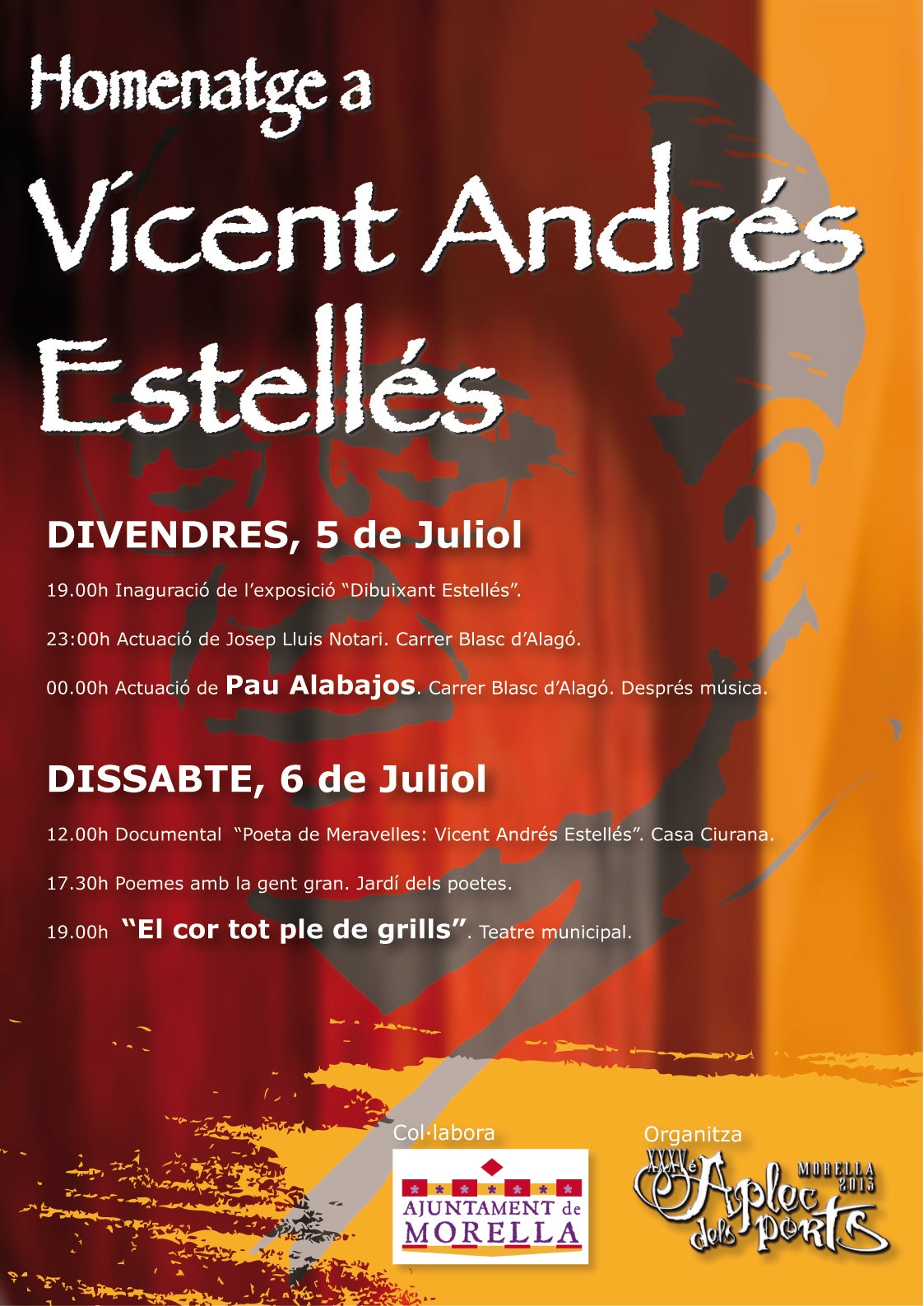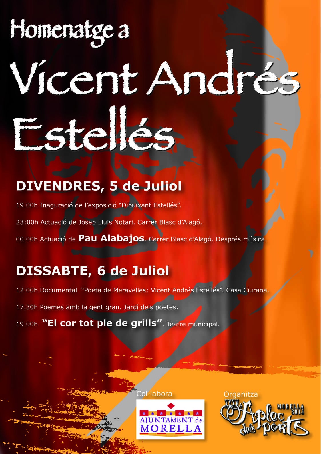 Aquest Divendres, la inauguració de l’exposició “Dibuixant a Estellés” posarà el punt de partida als actes del cap de setmana i quan el sol ja s’hagi amagat, els cantautors Pau Alabajos i Josep Lluís Notari posaran la nota musical al carrer dels porxes de Morella.