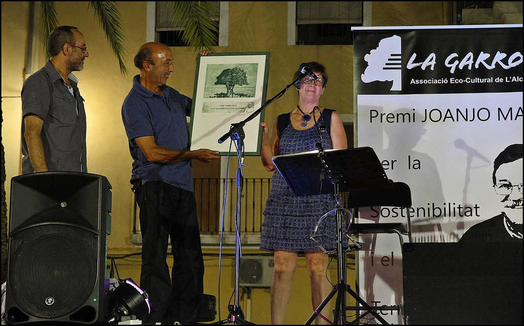 L’associació Cultural la Garrofera de l’Alcúdia de Crespins va lliurar en una emotiva cerimònia celebrada el passat dissabte, dia 11 de juliol, a la plaça de la Constitució, el tercer guardó del ‘Premi Joanjo Masó per la Sostenibilitat i el Territori’ a ACDEMA (Associació canalina per a la defensa del medi ambient) per haver desenvolupat una tasca continuada en favor de la sostenibilitat i el territori, adreçada a la millora de vida dels seus conciutadans, des de l’any 1994, quan un grup de joves, preocupats per les greus conseqüències dels incendis forestals que aquell any devastaren una part important dels nostres boscos, s’ajuntaren amb la intenció inicial que aquella catàstrofe ambiental no es tornara a repetir. Des d’aquell any, i ja en fa més de vint, han portat endavant un treball ininterromput, desinteressat, constant, i necessari, d’accions dirigides a la protecció, neteja, sensibilització i valoració del nostre entorn natural.