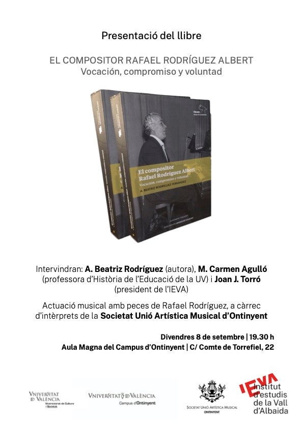 Divendres 8 de setembre assistirà la seua filla, Beatriz Rodríguez Fernández, a l’esdeveniment per a presentar la biografia del músic que ha publicat El compositor Rafael Rodríguez Albert. Vocación, compromiso y voluntad. En l’acte intervindran també M. Carmen Agulló, professora d’Història de l’Educació de la Universitat de València, i Joan J. Torró, president de l’IEVA i autor del llibre El Col·legi Nacional de Cecs. De Madrid a Ontinyent (1936-1939). La presentació serà a l’Aula Magna del Campus d’Ontinyent, a les 19.30 h, i tindrà acompanyament musical amb la interpretació d’algunes peces de Rodríguez Albert a càrrec de membres de la Societat Unió Artística Musical d’Ontinyent.