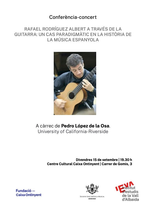El cicle tindrà continuïtat al cap de huit dies, divendres 15 ,amb la conferència-concert Rafael Rodríguez Albert a través de la guitarra: un cas paradigmàtic en la història de la música espanyola, a càrrec de Pedro López de la Osa, guitarrista professional que treballa a la University of California-Riverside en la tesi doctoral Unforgetting the Past: Internal Exiles and the Spanish Avant-garde under the Franco Dictatorship (1939-75) and beyond. Aquest estudiós també prepara una edició crítica sobre dues obres de Rafael Rodríguez Albert per a la fundació ONCE, i el llibre Otras mirada a Rafael Rodríguez Albert, un compositor republicano més allá de la composición. L’acte se celebrarà a les 19.30 h al Centre Cultural Caixa Ontinyent aquest divendres dia 8.