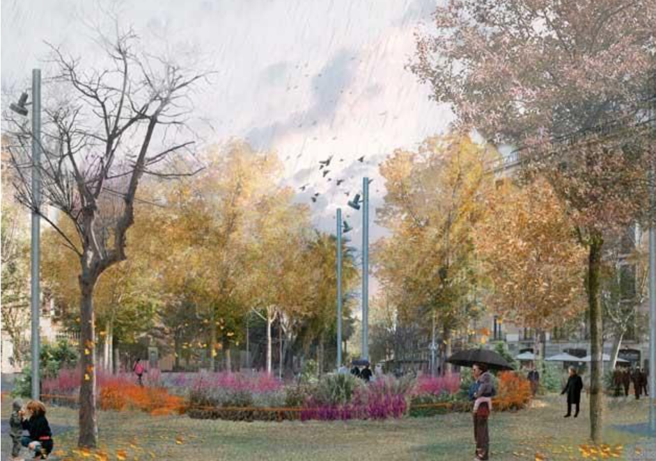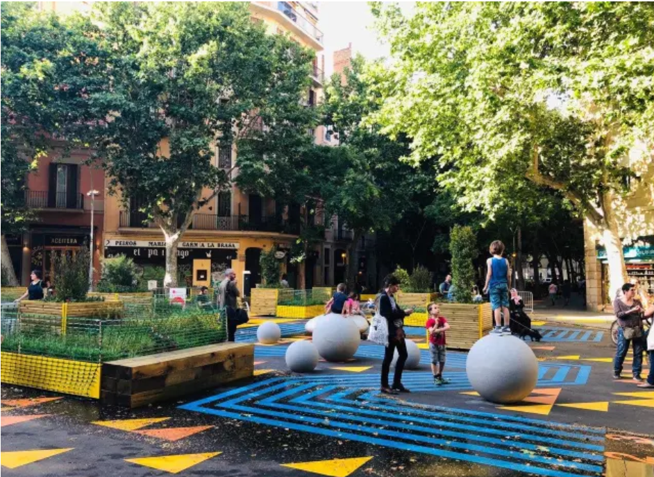 L’altra objecció que jo faria contra les superilles tampoc no té a veure amb cap dels seus trets específic, sinó que és vàlida per a qualsevol conversió en zona de vianants. Apunta a la concepció general d’un urbanisme que té la pretensió de naturalitzar o renaturalitzar la ciutat. La idea urbana de les superilles, enteses com a agrupacions de blocs d’un mateix ús, és evidentment un concepte propi de l’urbanisme del moviment modern racionalista. No és altra cosa que el concepte de zonificació, segons el qual se separen els usos entre ells i en relació amb les vies de circulació estructural. Ni tan sols aplicat a l’Eixample de Barcelona és nou, perquè ja el GATCPAC (Grup d’Arquitectes i Tècnics Catalans per al Progrés de l’Arquitectura Contemporània) ho va plantejar als anys trenta, en el marc del pla Macià. En el cas dels barris residencials, la necessitat de dotar-les de zones verdes també és un concepte bàsic de l’urbanisme modern, acceptat per tothom. El que és «nou» en les superilles de Colau és l’aberració d’aquesta idea en un sentit antiurbà. El «verd urbà» d’aquests «nous» urbanistes, com que s’aplica sobre la ciutat, és una capa superficial per a fer-nos la il·lusió de viure on no vivim i on no voldríem o no podríem viure. Si hi ha algun element «anti-Cerdà» en les superilles és precisament aquest. Perquè no hi ha idea més antiurbana que aquesta, mentre que el pla Cerdà és una concepció eminentment urbana. Íntimament lligat a la idea de la naturalització de la ciutat, hi ha en aquests urbanistes un irrefrenable horror vacui a l’hora d’ordenar un espai urbà. El carrer es converteix en una autèntica selva, no només de vegetació, sinó de mil andròmines —testos, pilons, dibuixos en paviment, arbrets… De tot això he parlat en altres articles (Naturalitzar la ciutat, No dissenyeu les places!). És suficient ara, a manera de memento admonitori, mostrar algunes imatges de les noves superilles. Per exemple, la següent correspon a la de Sant Antoni: