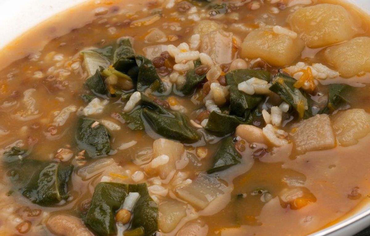Ingredients (4 racions): 150 g de fesols, 100 g d’arròs, 1 kg d’espinacs, 2 patates, 1 ceba, oli d’oliva i sal.