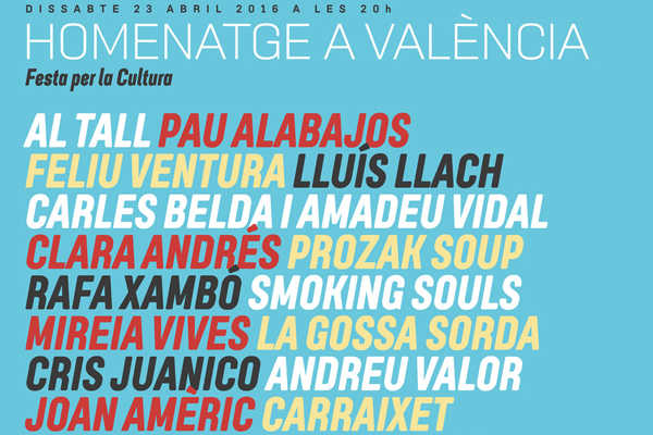 La Festa per la Cultura, organitzada per al dissabte 23 d’abril a la plaça de bous de València, ja té el cartell de participants i col·laboradors, de cantants i grups de música: Al Tall, Pau Alabajos, Feliu Ventura, Lluís Llach, Carles Belda, Amadeu Vidal, Clara Andrés, Prozak Soup, Rafa Xambó, Smoking Souls, Mireia Vives, les col·laboracions en acústic de La Gossa Sorda i Aspencat, Andreu Valor, Joan Amèric, Carraixet, Miquel Gil, Candela Roots, Sva-ters, Sèrman Mànser… I, a més Senior i el Cor Brutal, Cris Juanico, Ovidi3, Carles Santos i Tomàs de los Santos.