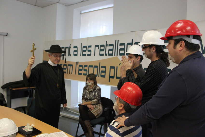 Han fet la presentació, protegits amb cascs, per l’enfonsament del sistema educatiu i dels centres i emmordassats, per de la nova Llei d’Educació (LOMQE), ʺque elimina la participació de la comunitat educativa, aposta per la segregació de sexes i afavoreix els interessos de la cúpula de l’església catòlicaʺ, han lamentat.