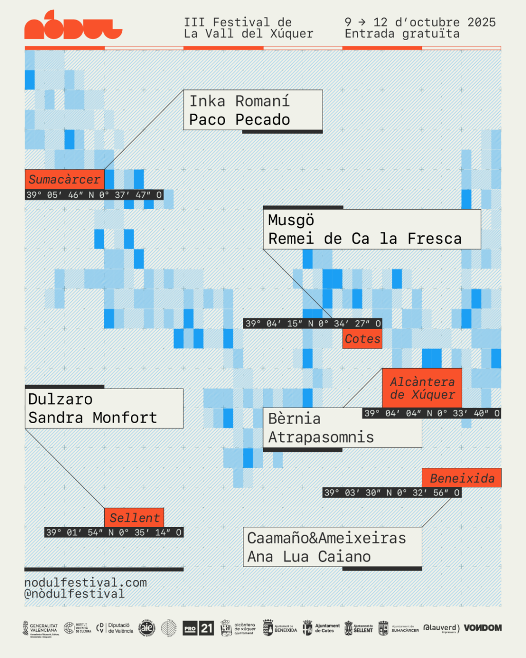 Enguany, Nòdul se celebrarà del 9 al 12 d’octubre en cinc poblacions de la Ribera Alta: Alcàntera de Xúquer, Beneixida, Cotes, Sellent i Sumacàrcer, i ha programat deu propostes musicals i escèniques.
