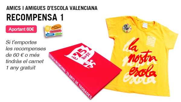 De les 13 recompenses que s’ofereixen al micromecenatge, set, a partir de la de 60€, inclouen el carnet d’Amic/Amiga amb un any gratuït, amb el qual els mecenes que hi han contribuït estaran informats de les activitats d’Escola Valenciana de forma directa i gaudiran dels avantatges, sortejos i descomptes en activitats diverses que promou l’entitat. Després d’aquest any, el que s’espera és que aquestes persones accepten continuar sent Amics i Amigues efectius.