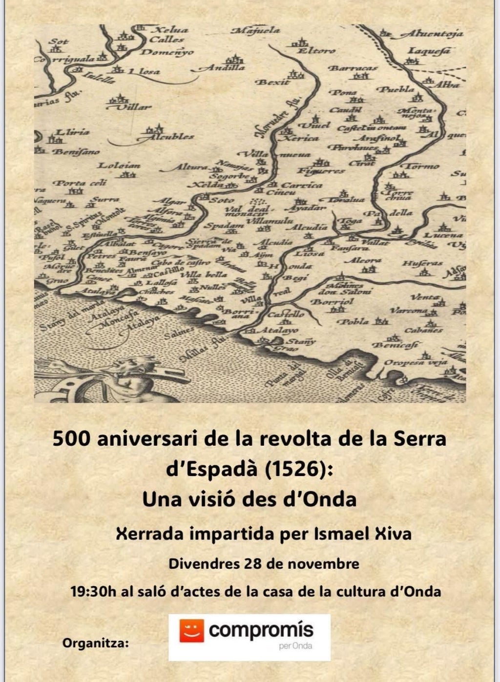 Compromís per Onda (la Plana Baixa) ha organitzat una xerrada divulgativa sobre la Batalla d’Espadà del 1526, un episodi clau de la història valenciana en què “un exèrcit cristià de fins a 7.000 soldats va massacrar els habitants de la Serra d’Espadà”. L’acte, titulat “500 aniversari de la Revolta de la Serra d’Espadà (1526): una visió des d’Onda”, tindrà lloc aquest divendres, 28 de novembre, a les 19.30 hores, a la Casa de Cultura de la ciutat (carrer de Balmes, 2), i serà d’accés lliure.
