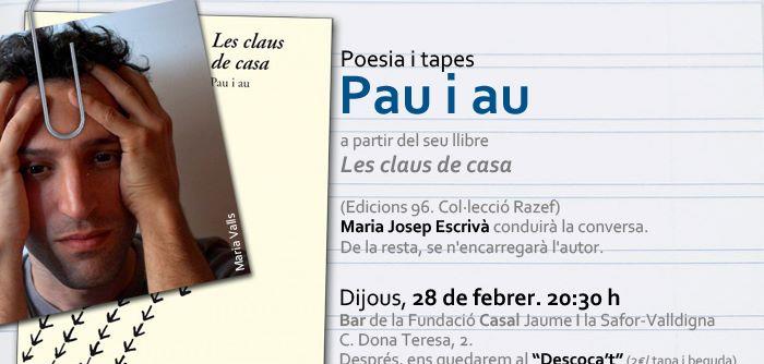 El bar de la Fundació Casal Jaume I la Safor-Valldigna acull el pròxim dijous, a les 20.30 hores una conversa i recital poètic amb Pau i au, a partir del seu llibre Les claus de casa ( Edicions 96 Col·lecció Razef).