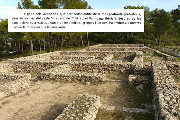 En un altre dels paràgrafs de la proposició es pot llegir: ‘La parla dels valencians, que parteix sens dubte de la més profunda prehistòria, s’escriu des del segle VI abans de Crist amb el llenguatge ibèric.’