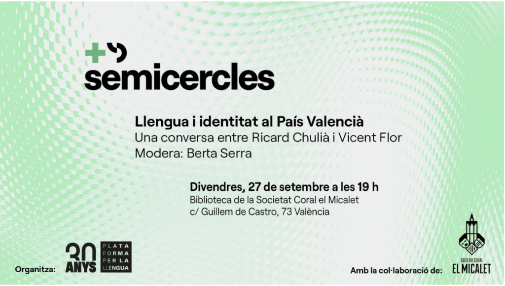 Plataforma per la Llengua ha organitzat una conversa sobre llengua i identitat valencianes entre Ricard Chulià i Vicent Flor, moderada per Berta Serra, aquest divendres, 27 de setembre, a les 19 h, a la biblioteca de la Societat Coral el Micalet, a València.