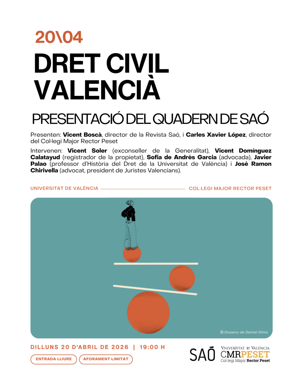 La sessió serà presentada per Vicent Boscà, director de Saó, i Carles Xavier López, director del Col·legi Major Rector Peset. A continuació, intervindran diverses veus autoritzades que han participat en aquest Quadern: Vicent Soler, exconseller de la Generalitat; Vicent Domínguez Calatayud, registrador de la propietat; Sofia de Andrés Garcia, advocada; Javier Palao, professor d’Història del Dret de la Universitat de València, i José Ramon Chirivella, advocat i president de Juristes Valencians.