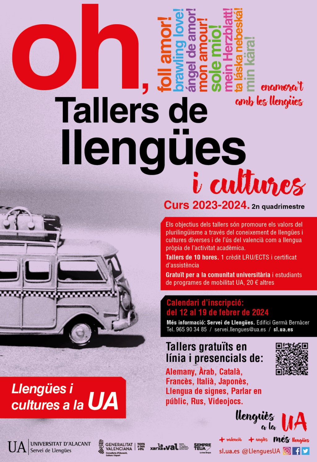 Amb l’objectiu de promoure els valors del plurilingüisme des del coneixement de les llengües i cultures diverses, i sempre amb l’ús del valencià com a llengua pròpia de l’activitat, el Servei de Llengües de la Universitat d’Alacant (UA) desenvolupa un any més els Tallers de llengües, una iniciativa acadèmica de deu hores que té lloc al campus de la UA, que computa crèdits per als participants i que té en la promoció del valencià el seu eix central.