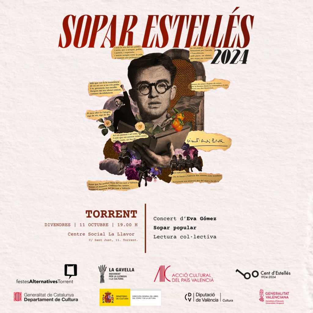 Torrent (Horta Sud) farà el mateix amb el Sopar Estellés que se celebrarà divendres dia 11 d’octubre a les 19:00 al Centre Social la Llavor amb un concert d’Eva Gómez, un sopar popular i un acte de lectura col·lectiva.