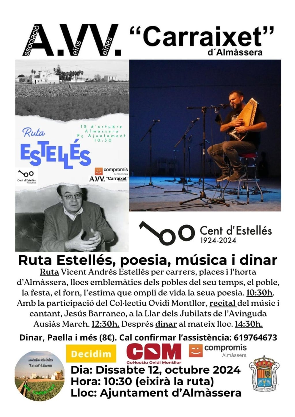 Dissabte hi haurà altres dos homenatges. Un serà a Almàssera (Horta Nord), promogut per l’Associació de Veïns Carraixet, que oferirà una ruta, un recital i un dinar des de les 10:30 del matí, hora en què eixirà la ruta des de l’Ajuntament de la localitat.