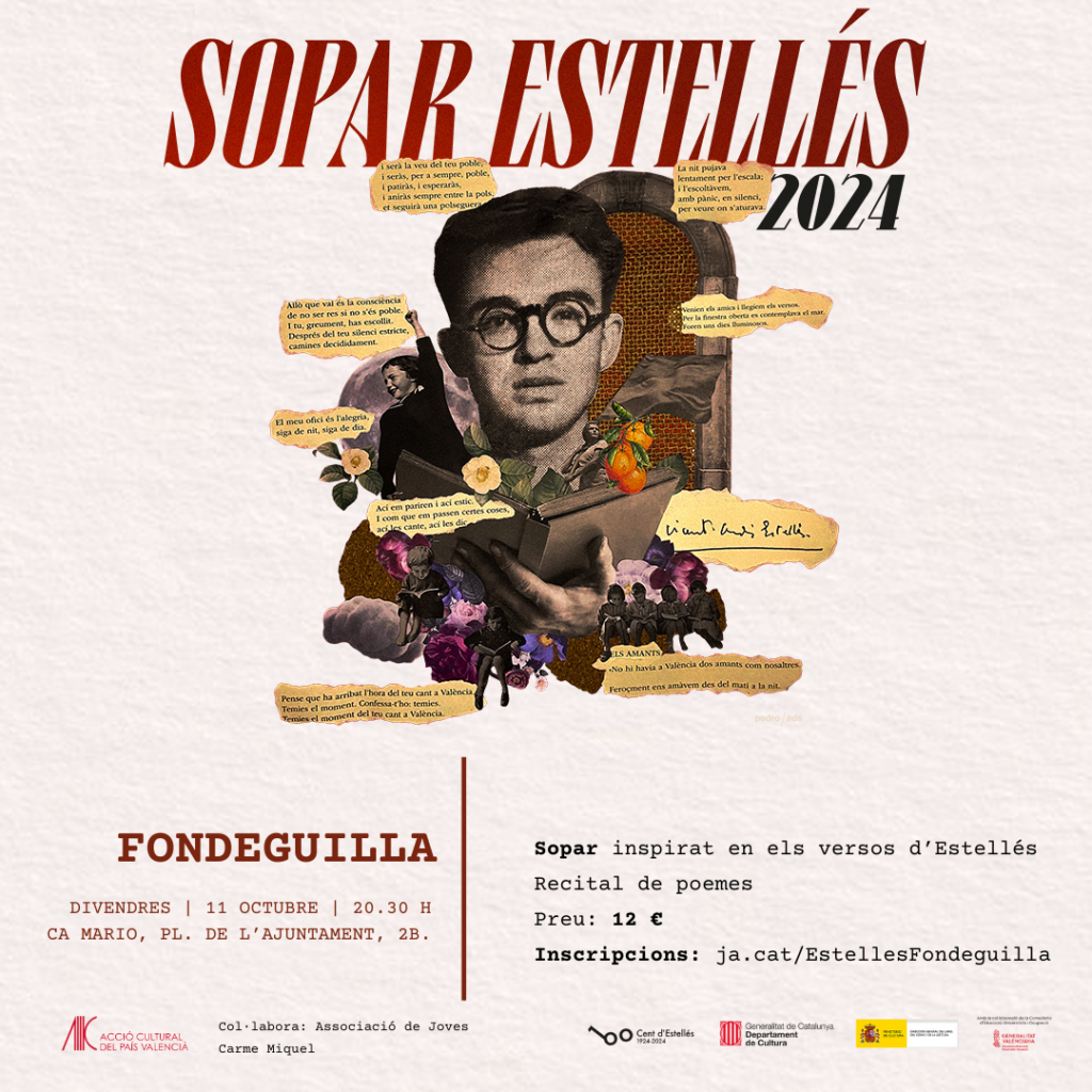 Fondeguilla (Plana Baixa) farà també un Sopar Estellés aquest divendres a les 20:30 a Ca Mario, a la Plaça de l’Ajuntament, amb un recital de poemes.