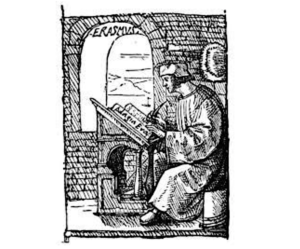 El 1515, Hans Holbein, llavors un jove de dèsset anys que treballava en una impremta de Basilea, va dur a terme un retrat d’Erasme de Rotterdam per a l’edició d’Elogi de la follia. Johannes Froben, el seu patró, li havia encarregat que il·lustrara el llibre. Va seguir un model italià usat sovint -havia servit per a representar sant Agustí o Savonarola, entre altres- que mostra un monjo erudit que està escrivint en un pupitre a la seua cel·la en el moment en què es deté i pensa (Fritz Saxl, La vida de les imatges, 1957). El mateix Erasme, tanmateix, conta a l’inici, en la dedicatòria al seu amic Thomas More, que l’havia concebut viatjant a través dels Alps i no reclòs al seu estudi: “Dies enrere, quan tornava d’Itàlia cap a Anglaterra, per no passar el temps en fantasies grolleres i vulgars mentre muntava a cavall, vaig preferir d’ocupar-me en alguna de les activitats que compartim […] Cercava, doncs, un entreteniment; però l’ocasió no em semblava gaire oportuna per abordar un tema seriós, i vaig posar-me a compondre un elogi de la follia”. Posteriorment, durant un sojorn a casa de More, a Londres, redactaria la versió definitiva en pocs dies.