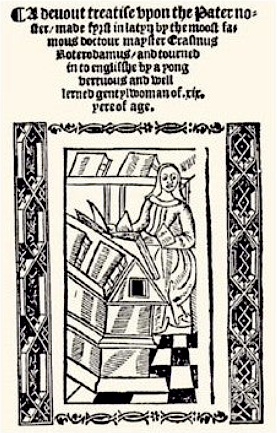 Deu anys més tard, una altra il·lustració continua aquesta tradició iconogràfica, tot i que en aquest cas la persona erudita és una dona. Malgrat que no porta cap ploma a la mà, més aviat fa la impressió que està llegint i que s’ha aturat i ha apartat la vista del text, també la veiem en un lloc semblant, ple de llibres, asseguda davant d’un escriptori amb el volum en què s’ha endinsat obert damunt. La il·lustració va aparèixer en una de les primeres edicions que es conserven, concretament en una del 1525, d’A Devout Treatise upon the Paternoster, la traducció a l’anglès de la Precatio Dominica, d’Erasme, un comentari al Parenostre, feta per Margaret Roper (1505-1544), la filla gran de Thomas More. Exceptuant-hi aquesta obra, publicada amb 19 anys, i d’algunes cartes disperses, la resta de la seua producció -sabem que va escriure versos en llatí i grec, discursos llatins, una imitació de Quintilià i el tractat The Four Laste Thynges, que el seu pare considerava igual que els seus- ha desaparegut. More s’hi referia amb admiració amb termes com ara “Margareta charissima” o “Dulcissima filia”, i Erasme, en la correspondència que va mantindre amb ella, li deia “Optima Margareta”. Per a l’humanista, les germanes More, amb les quals sempre va tindre una actitud paternal, eren “sensibles, bones escriptores, franques i amigables”.