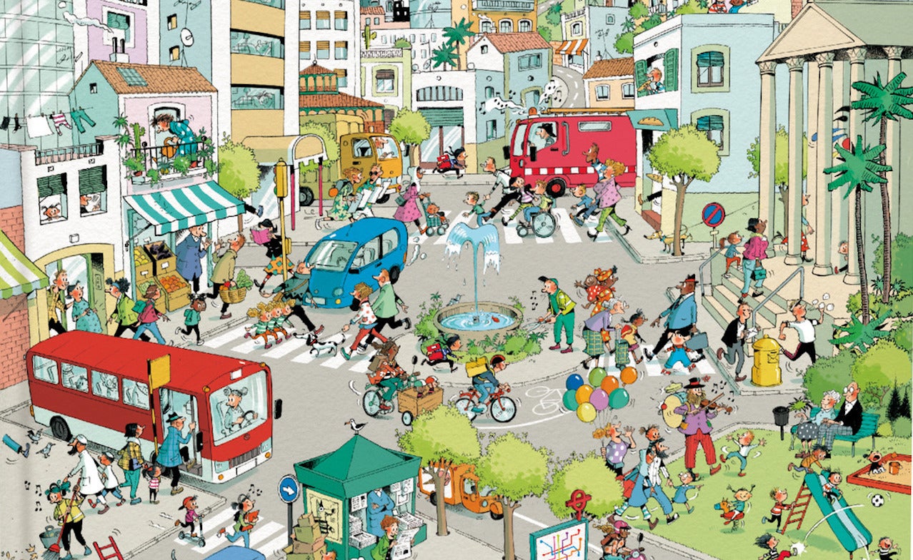 Centrem-nos ara en l’obra. Hi ha molts àlbums corals que mostren la vida quotidiana d’una ciutat. Són ben coneguts els de Berner i els de la parella Göbel i Knorr (tots ells d’inspiració germànica). La ciutat de Cristina Losantos, tot i ser indeterminada, és ben actual i més propera als nostres lectors. Aquesta il·lustradora ja havia creat una sèrie estupenda d’imatginaris corals desplegables sense paraules que va publicar La Galera en la col·lecció «Espais» (2003-2005) i que, per cert, ens encantaria que es reeditessin. El dibuix a tinta minuciós, característic d’aquesta autora catalana, que domina a la perfecció l’estil gràfic de línia clara, és molt apropiat per a les obres corals. Els personatges de Losantos són ben expressius i les seves escenes són sempre plenes de detalls i d’anècdotes ben divertides.