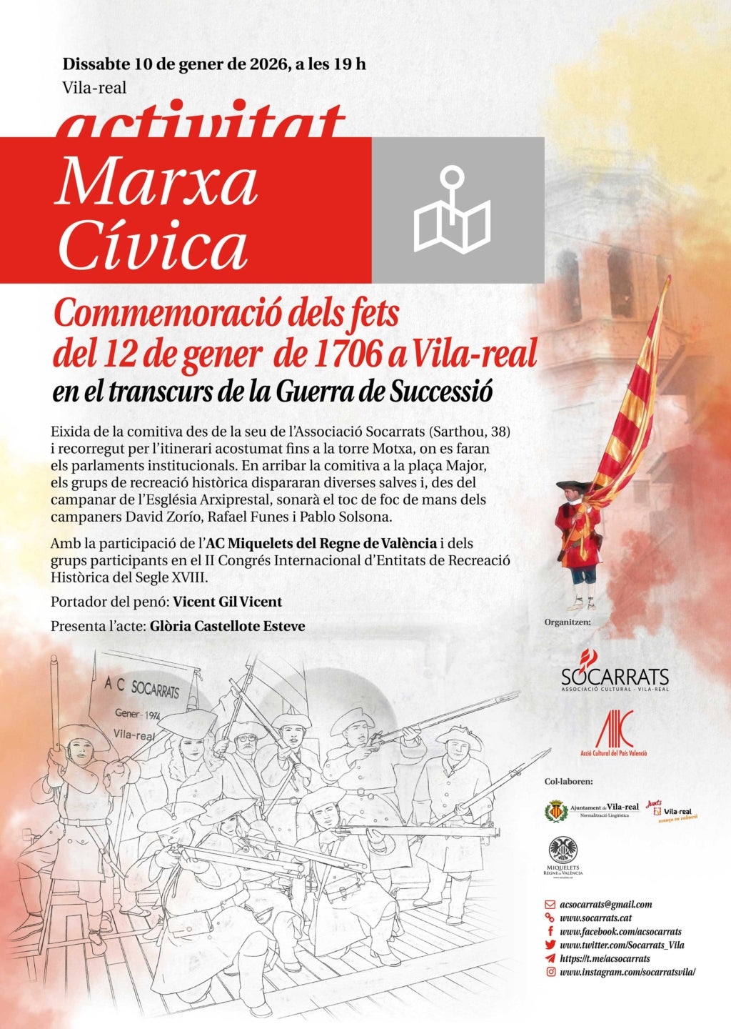 Vila-real (la Plana Baixa) acull aquest dissabte, 10 de gener, una jornada de memòria històrica i recreació cultural amb motiu de la celebració de la Marxa Cívica que commemora la crema de Vila-real per les tropes borbòniques i del II Congrés Internacional d’Entitats de Recreació Històrica del Segle XVIII, dues iniciatives complementàries que situen la ciutat com a referent en la divulgació rigorosa dels fets del 1706 i del context històric de la Guerra de Successió.