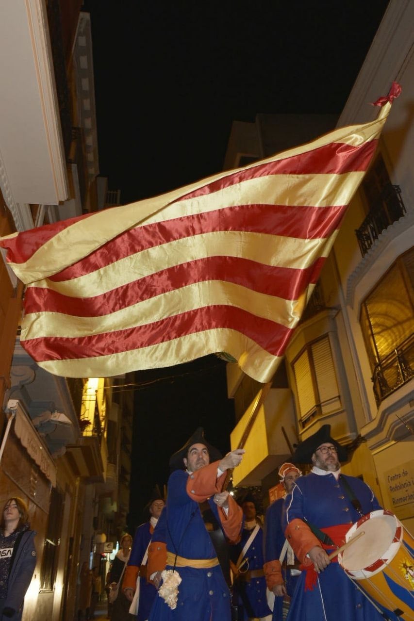 A la vesprada, a les 19 h, la comitiva, en què participaran els Miquelets del Regne de València i els grups participants en el II Congrés de Recreació Històrica del Segle XVIII, de la seu de Socarrats, al carrer Sarthous, i recorrerà l’avinguda del Cedre, el carrer de Pere III, el carrer Major Sant Jaume, la plaça de la Vila, on es dispararan diverses salves, i, des del campanar de l’església arxiprestal, sonarà el toc de foc de mans dels campaners David Zorio, Rafael Funes i Pablo Solsona. El seguici continuarà pels carrers Major Sant Domènec i Lluís Vives fins a la torre Motxa, on tindran lloc els parlaments institucionals, presentats per Glòria Castellote. El portador del penó serà Vicent Gil.
