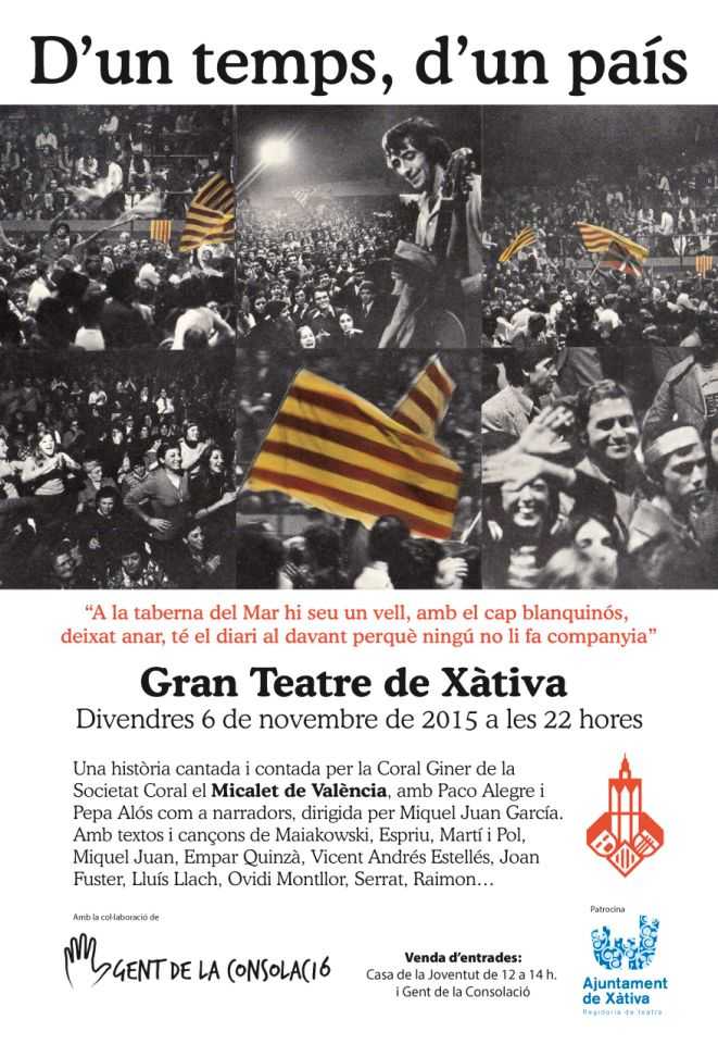 Aquest divendres, dia 6 de novembre, a les 22 hores, la Coral Giner de la Societat Coral el Micalet de València dirigida pel xativí Miquel Juan García portarà a terme l’espectacle ‘D’un temps d’un país’.