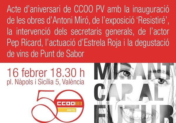 El pintor i amic de les Comissions Obreres del País Valencià, Antoni Miró, presentarà els quadres que quedaran a les parets de la seu i que retraten Joan Fuster, Vicent Andrés Estellés, Sanchis Guarner i Enric Valor. També s’inaugura l’exposició Resistiré, 50 fotografies representatives dels últims anys de lluita contra les retallades a la classe treballadora per part del capitalisme salvatge.