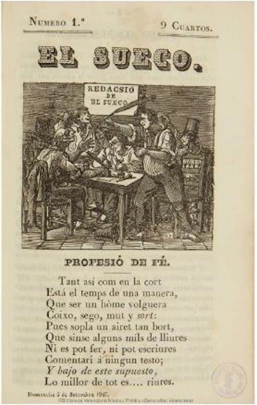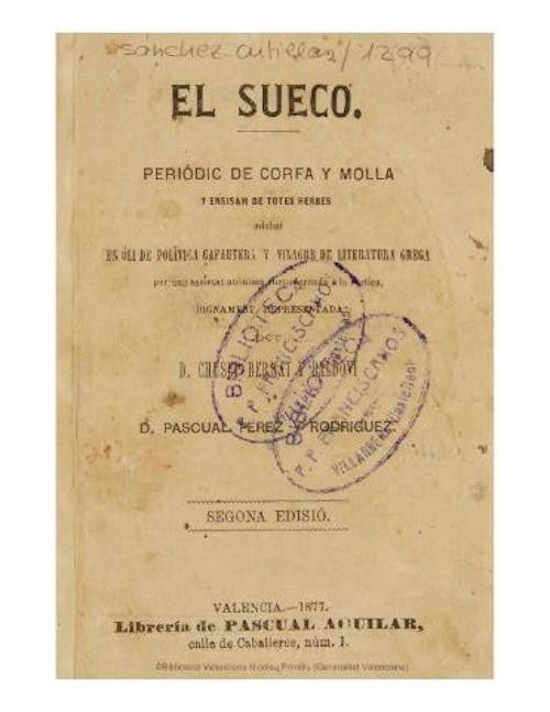 El Sueco, escrit tant en valencià com en castellà, va ser un dels periòdics més combatius del regnat d’Isabel II. Va ser multat i segrestat en moltes ocasions, el seu èxit va ser més que notable, amb una tirada propera als 5.000 exemplars. Aquestes tres publicacions tenien en comú un tractament de la política vista «des de baix» en forma de poemes, diàlegs, passatemps… Destinat a un públic popular, majoritàriament treballadors del camp, el seu objectiu era el de formar i instruir el poble en el coneixement del nou sistema constitucional i oferir els elements necessaris perquè poguera fer-se una idea de quina era la seua posició respecte del poder, dins del nou sistema polític.